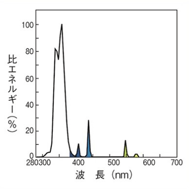 光化学作用と蛍光作用のある近紫外線(ピーク波長352nm)を効率よく放射するランプで、 わずかに可視光も放射しています。